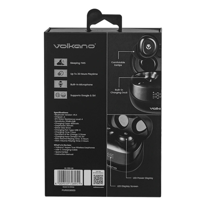 Unwind, power through workouts, or stay hands-free on the go with the Volkano Aspen True Wireless Sleeping TWS Earphones, purpose-built for comfort and performance. Ideal for those seeking Bluetooth earphones with voice assistant support and all-day battery life, these compact buds deliver a snug, lightweight fit that even makes them suitable for bedtime use. With compatibility for Google Assistant and Siri, a responsive built-in mic, and IPX4 water resistance, the Aspen series is designed for every moment—rain or shine, gym or commute. You’ll get up to 20 hours of total playtime, with the sleek charging case providing three full recharges. For anyone looking for water-resistant wireless earbuds that combine clarity, comfort, and smart features, Aspen is a smart, budget-conscious choice. Google and siri Up to 20 hours playtime Built in mic IPX4 SLEEPING TWS