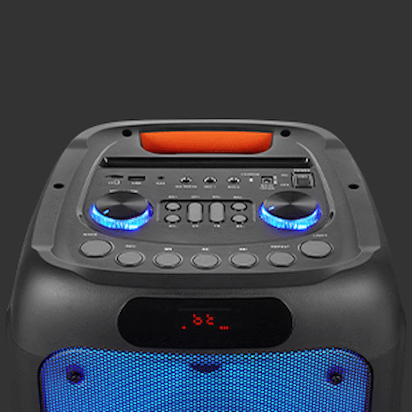 Get every party started with the Helios series! With dual 8 inch drivers, incredible sound quality, 2x microphone inputs, a guitar input jack and light effects – the Helios leaves nothing to the imagination. All extra features have been carefully thought out and put together to ensure the success of every event you have planned – be it a casual sunday braai, a family karaoke night or a birthday rager. The speaker has wheels and a handle which allow for easy relocation and transporting of the speaker. It also comes with multiple other input features – like a built in FM radio function, SD card input, aux audio jack as well as USB ports.
