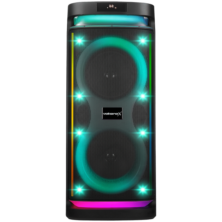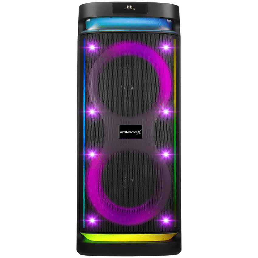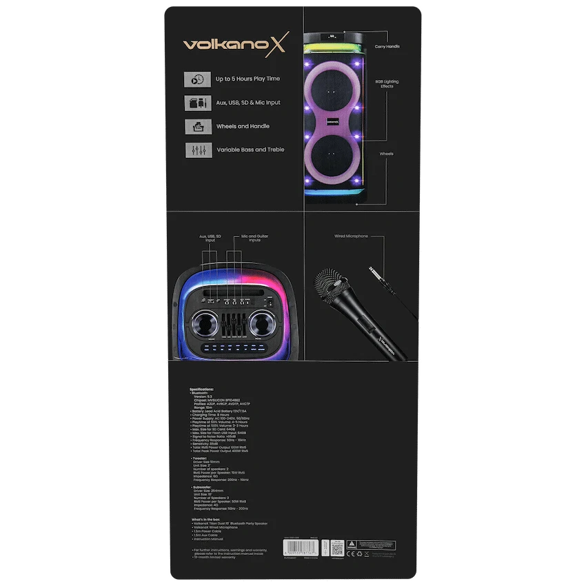 Volkano X Titan Series Dual 10″ Bluetooth Party Speaker – 100W front of Packaging 400w Peak Power True Wireless Pairing RGB Lighting Effects Side of packaging 100 Watts RMS Wheels and Handle AUX, USB and SD Inputs FM Radio Mic and Guitar Inputs Back Up to 5 hours playtime AUX, USB and SD Inputs Wheels and Handle Variable Bass and Treble