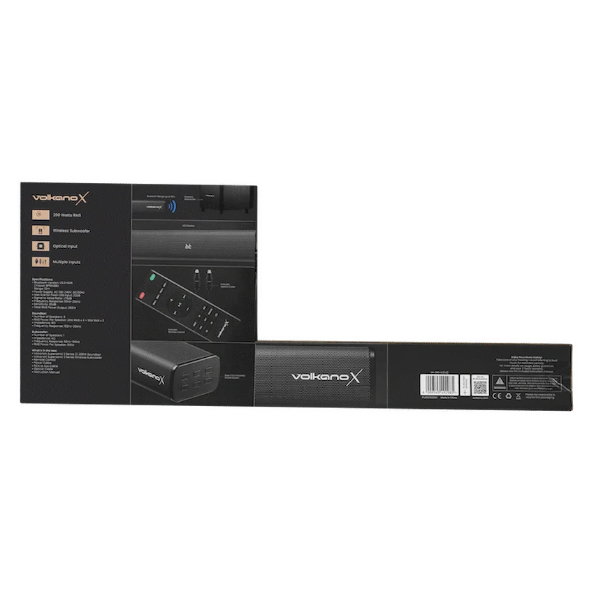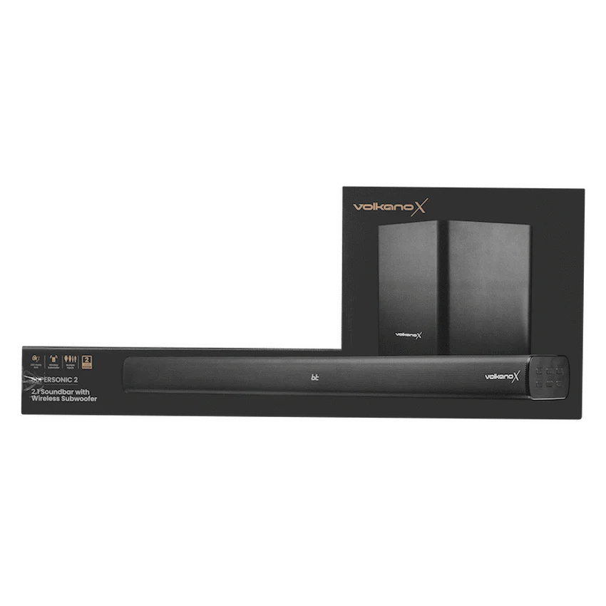 VolkanoX Supersonic 2 Series 2.1 Bluetooth Soundbar with Wireless Subwoofer – 200W.Powerful 2.1 channel home theatre soundbar with HDMI ARC, optical & USB inputs.