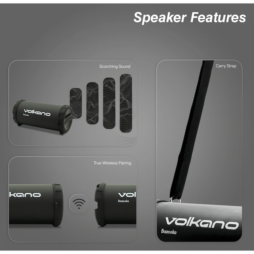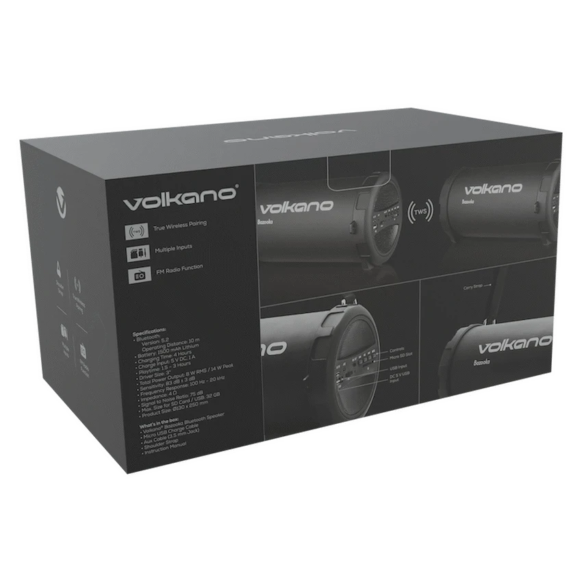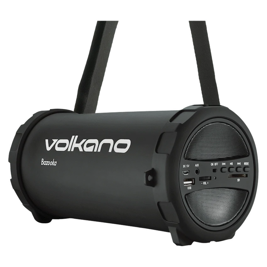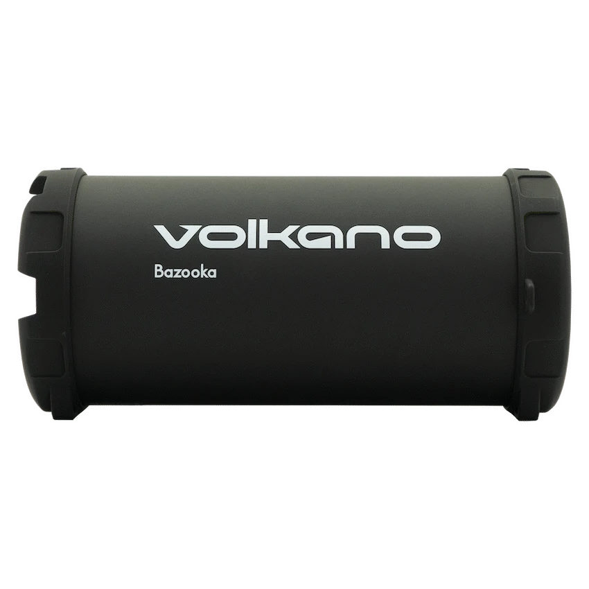 The original Volkano Bluetooth speaker and still one of our top sellers, the Volkano Series Bazooka True Wireless Speaker boasts explosive bass and scorching sound for its small size. The speaker features 12W of peak power in a unique barrel design to amplify low notes for rich, deep bass. Connect your favorite music player via Bluetooth or aux in; or plug in a USB drive, SD Card or activate FM Radio mode for instant sound. Control everything integrated playback and volume controls. Lightweight and portable, the Volkano Bazooka comes with a carry strap, so you can take your music with you wherever you go. The sturdy design is finished in a rubberized touch to prevent bumps and scrapes. Featuring True Wireless Technology, you can pair two Volkano Bazooka Series Speakers together wirelessly to experience True Surround Sound.
