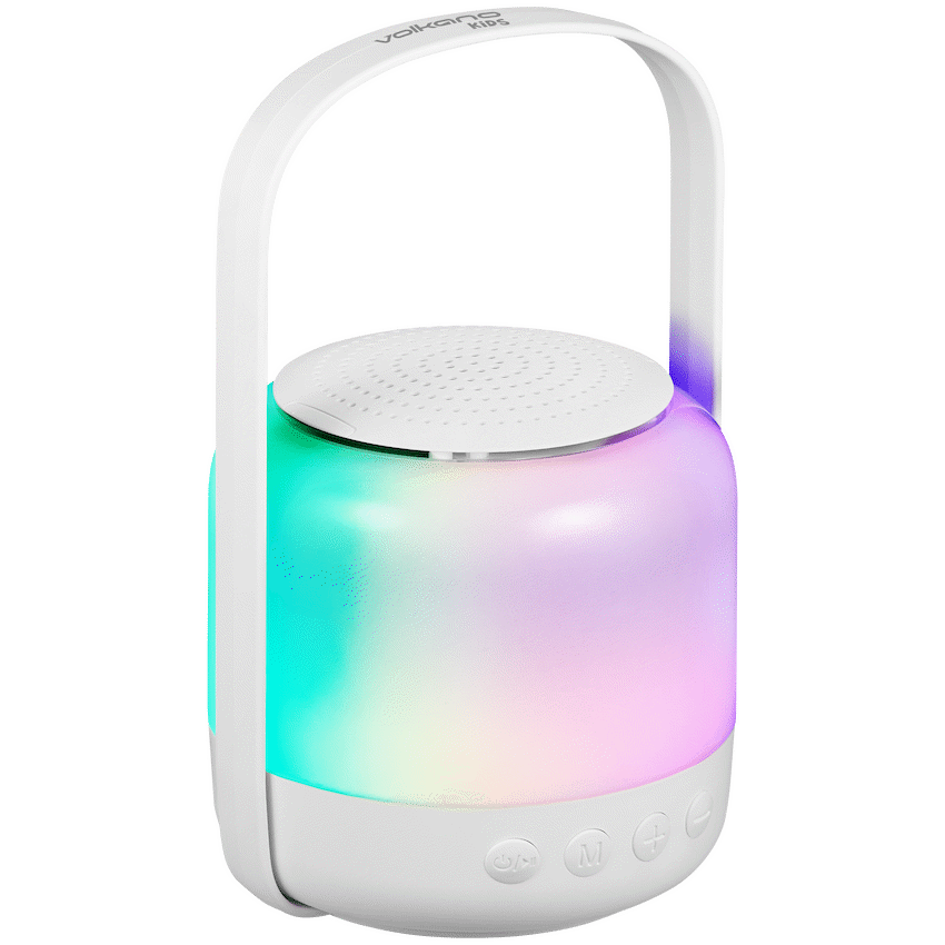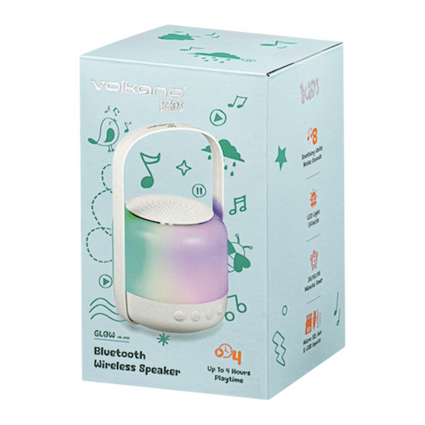 Volkano Kids Glow Series speaker with light Up to 4 hours playtime Multiple Inputs (USB, Micro SD, Aux) 8 white noise song 6 LED lighting effect Fixed Carry Handle