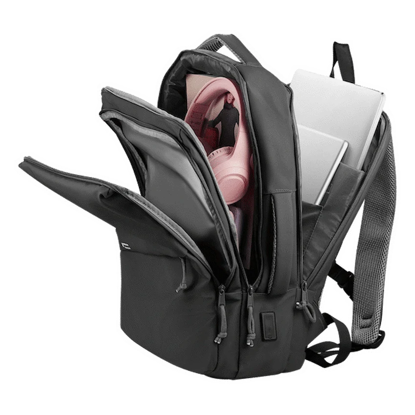 A high-quality laptop backpack with a padded compartment that fits laptops up to 15.6”, designed to accommodate all your business and overnight packing needs, whilst fitting neatly under the seat in front of you on an aeroplane. Multiple internal and external pockets provide ample storage for organizing chargers, cables, power banks, keys, wallets, water bottles, notebooks, documents, and other daily essentials. Made with durable, water-resistant materials and reinforced stitching for long-lasting use. Features adjustable padded shoulder straps, breathable back padding, a top handle for carrying, side handles for easy lift, and a secure zipper closure for added protection during travel or daily use. Large Capacity Water-resistant outer fabric 3 main compartments 17.3” Laptop compartment Large compartment for overnight goods Wet & Dry compartment USB Charging port Wide & padded shoulder straps Ultra padded & breathable back Adjustable chest clip