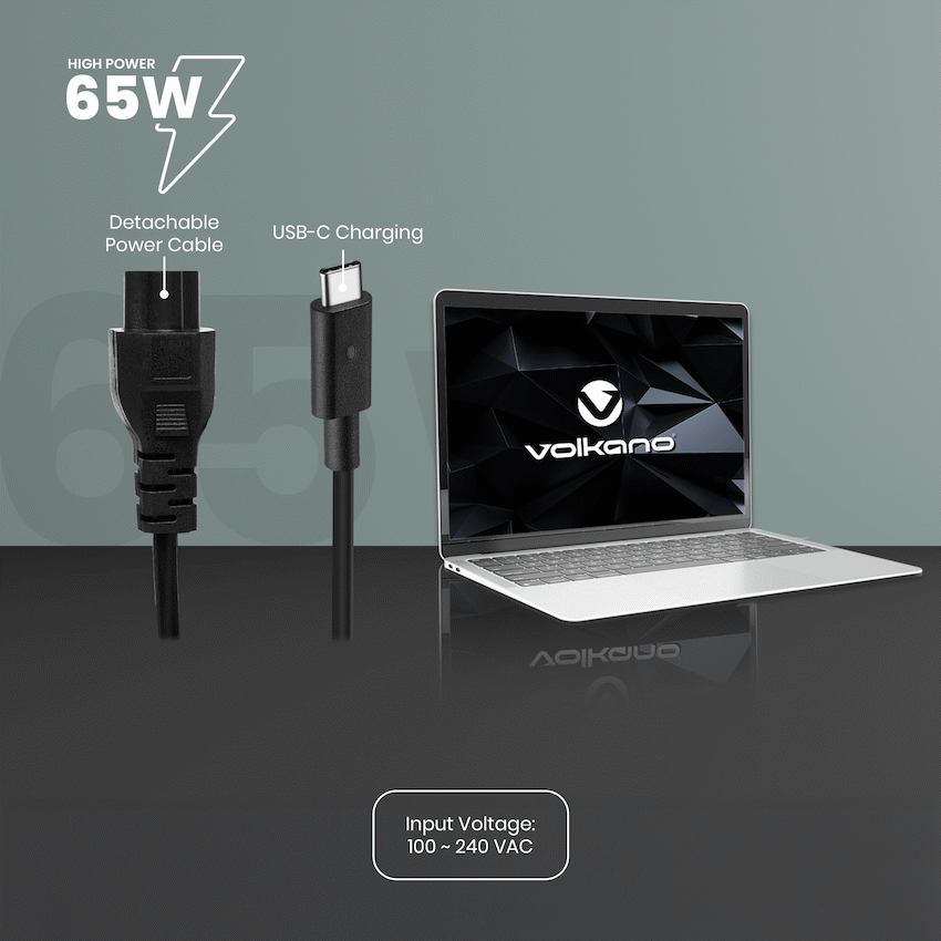 Volkano Brio Slimline series Type-C 65W Laptop Charger, 65W high power in an ultra‑slim charger for Type‑C laptops and devices