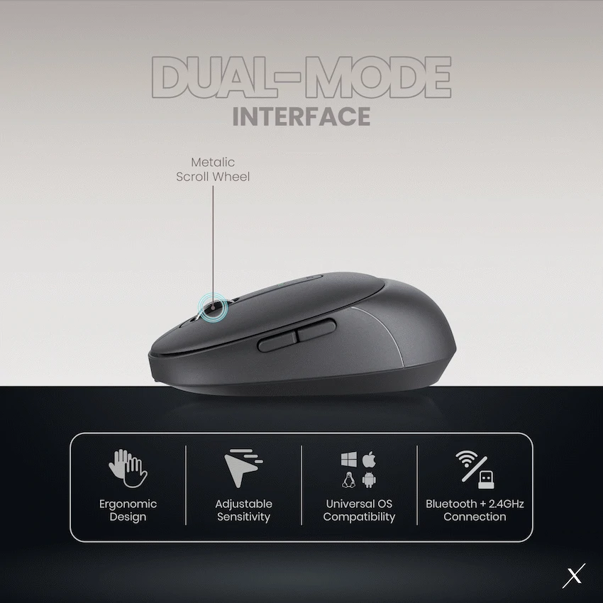 The VolkanoX Crater Bluetooth Wireless Mouse is built for users who demand flexibility, precision and comfort. Whether you’re working, gaming or browsing, it delivers with dual‑mode connectivity (Bluetooth + USB‑C/2.4 GHz receiver), adjustable DPI up to 4000, and whisper‑quiet buttons with a premium metal scroll wheel. Its ergonomic shape ensures comfort during long sessions, and the large internal 500 mAh battery supports up to 6 months of use between charges.