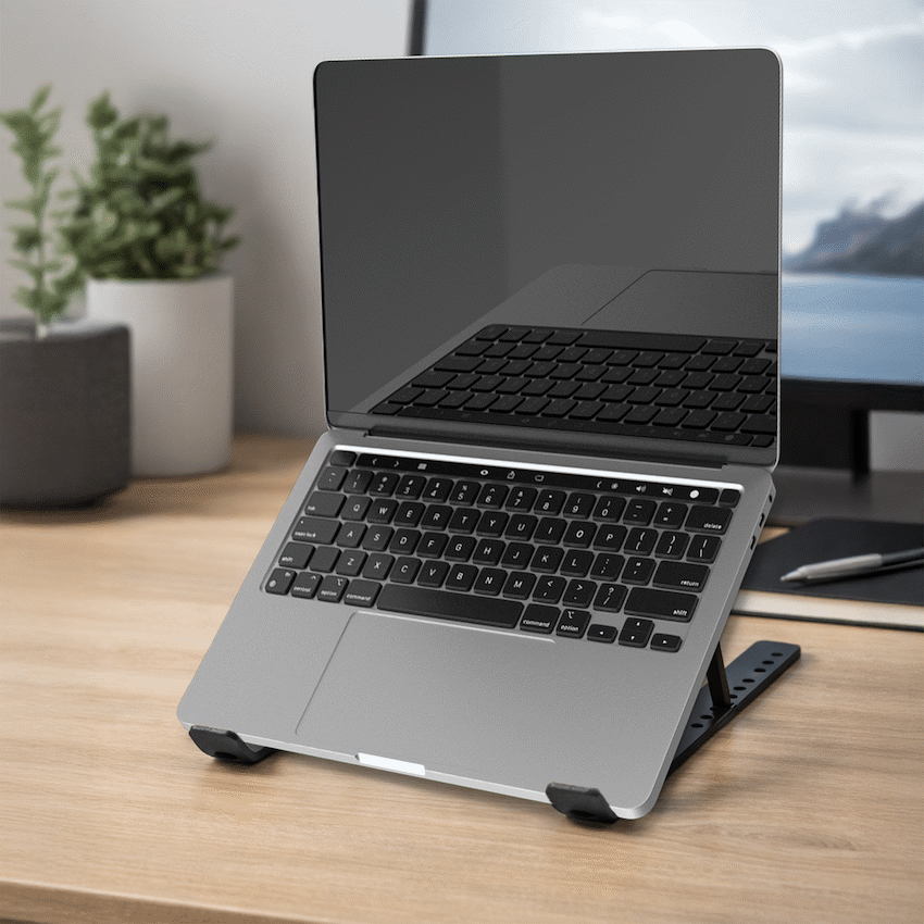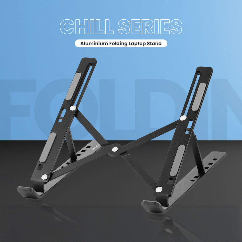 Work more comfortably with the Volkano Chill Series Aluminium Folding Laptop Stand (VK‑8147‑BK). This sleek, anodised aluminium notebook stand lifts your laptop for better posture—helping reduce neck and shoulder strain—and improves ventilation to prevent overheating. It’s foldable, portable and ideal for use at home, the office, cafés or on the go. Designed for flexibility, it offers angle adjustments between 15° and 40°, allowing you to set the screen to a height that suits your eyesight. When not in use, it folds flat to a compact size (≈ 44 × 13 × 253 mm), so it fits easily in your laptop bag. Includes non‑slip pads to hold your gear securely and a soft velour carry pouch for protection and easy transport. Folding laptop stand • Folded Size: 44 x 13 x 253 mm • Expanded Size: 253 (L) x 150 (H) x 184 (W) • Weight: 310 g • Product Angle Adjustment: From 15° ~ 40° • Material: Anodised Aluminiu