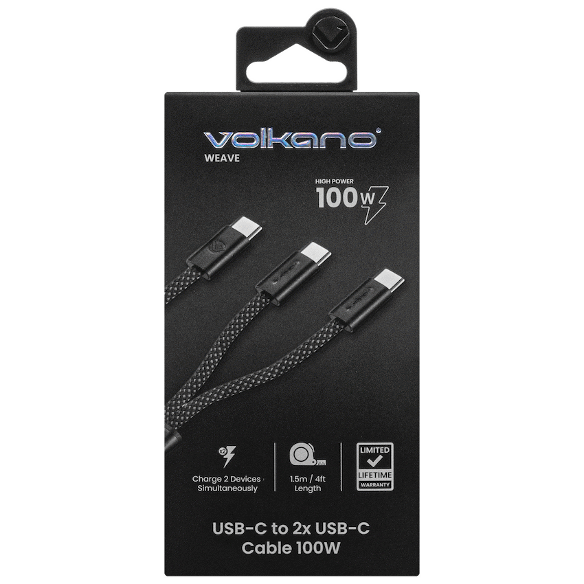 Volkano Weave Series USB C to 2 USB C 1.5m Black 100W