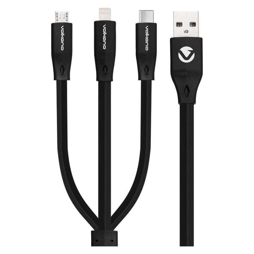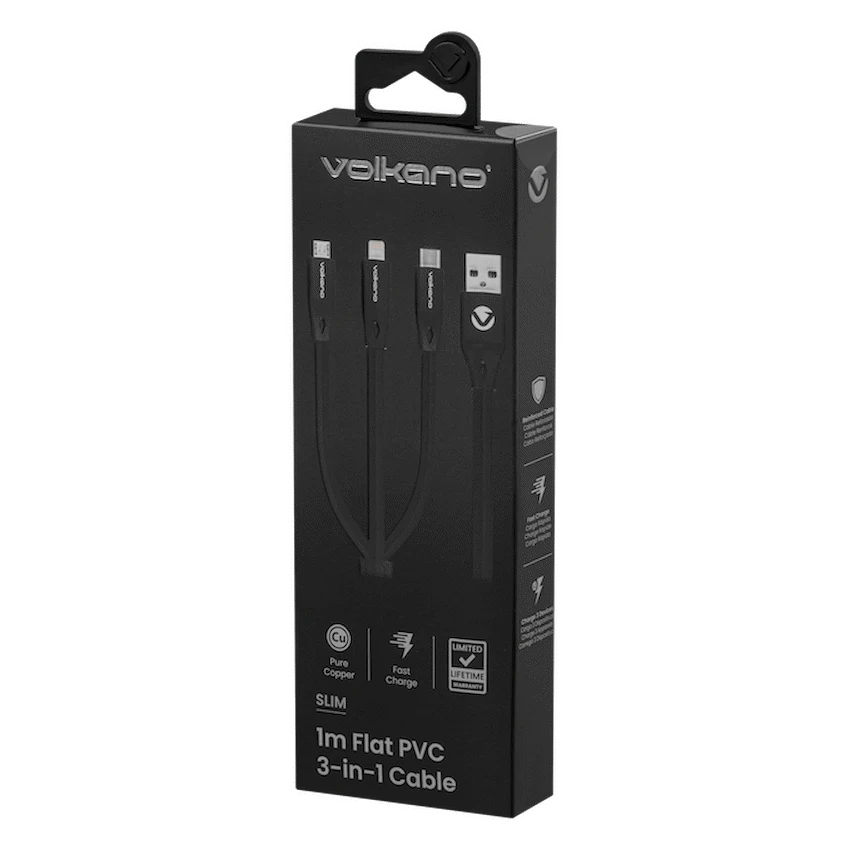 Simplify your charging routine with the Volkano Slim Series 3-in-1 Flat PVC Charging Cable. Delivering up to 30W of power, this durable and reinforced cable features a USB-A input and three output connectors—Micro USB, Type-C, and Lightning—allowing you to charge up to three devices simultaneously. Its flat, tangle-free design and 1-meter length make it perfect for everyday use, whether at home, in the office, or on the go.