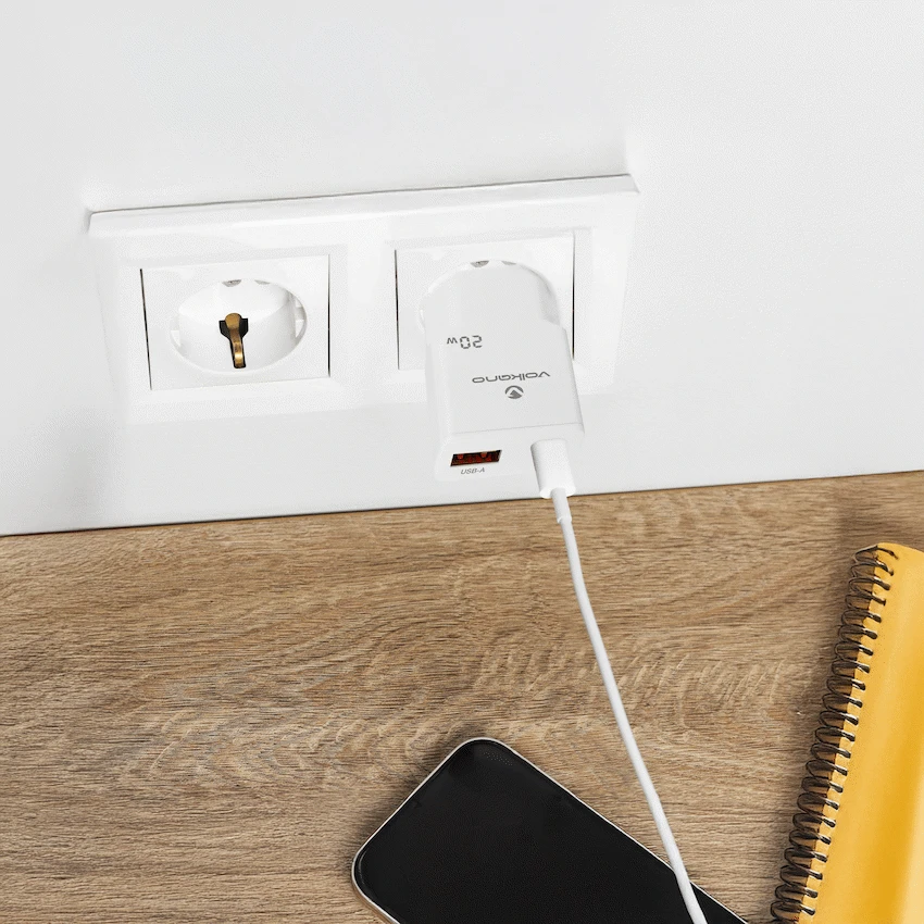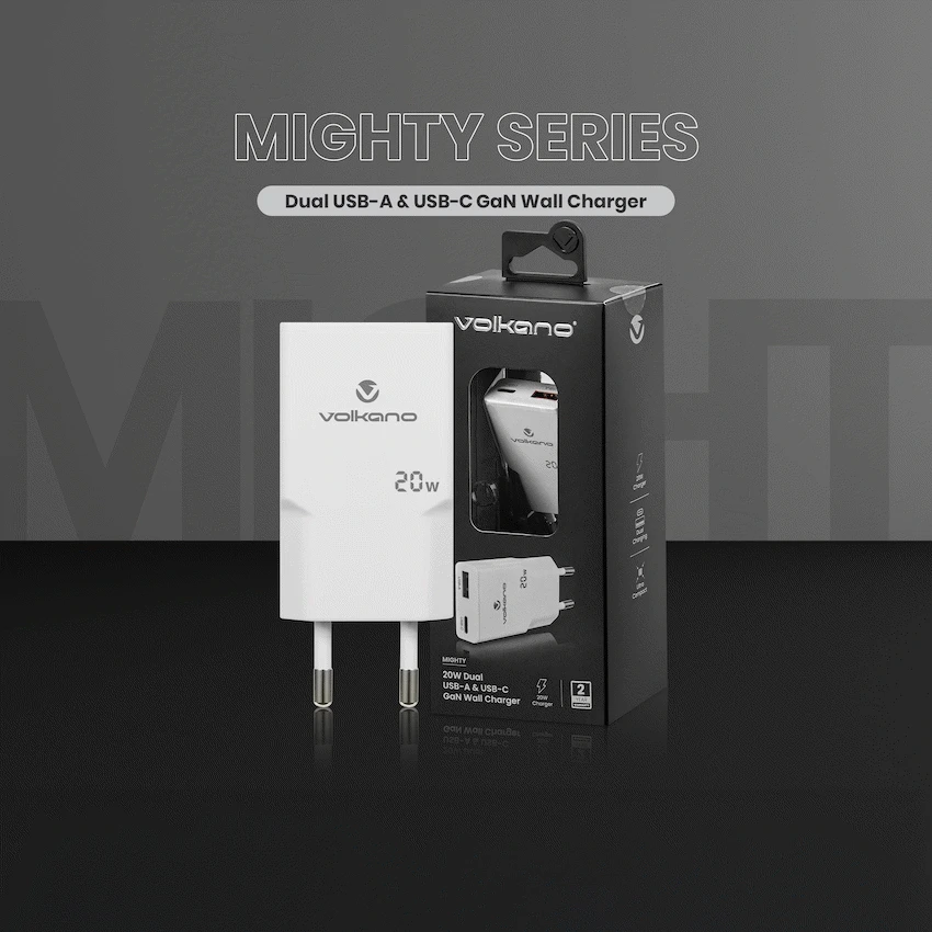The Volkano Mighty Series Wall Charger is the ideal solution for today’s on-the-go lifestyle. Designed with cutting-edge GaN technology, this compact charger delivers powerful and reliable performance in a sleek, travel-friendly form. Whether you’re charging your smartphone, tablet, or USB-C accessories, the dual-port output ensures you can power two devices simultaneously without compromising speed or efficiency. Compact and Portable – The space-saving GaN design makes it ideal for travel, home, or office use. Dual Output Convenience – Charge two devices simultaneously with USB-A and USB-C output ports — no need to choose between your phone and other gadgets. Fast Charging Support – Delivers up to 20W of power with USB-C for quick top-ups, compatible with Power Delivery (PD) and PPS charging protocols. Universal Compatibility – Works with a wide range of devices including smartphones, tablets, wireless earbuds, power banks, and more. Global Voltage Support – Input range of 100-240V makes it ideal for international use.