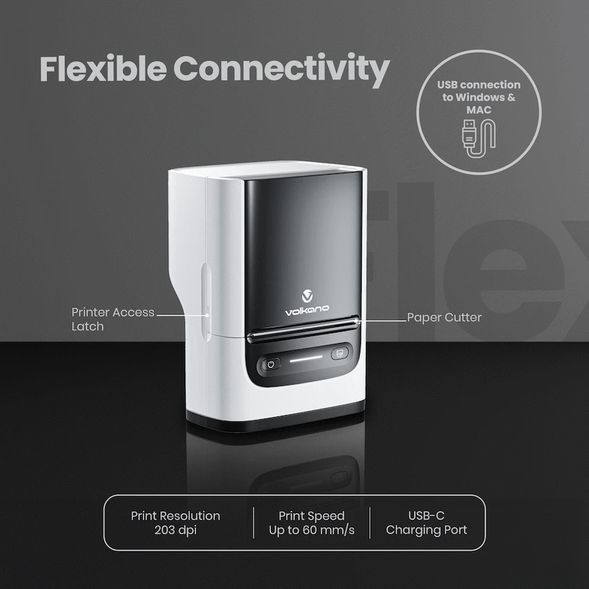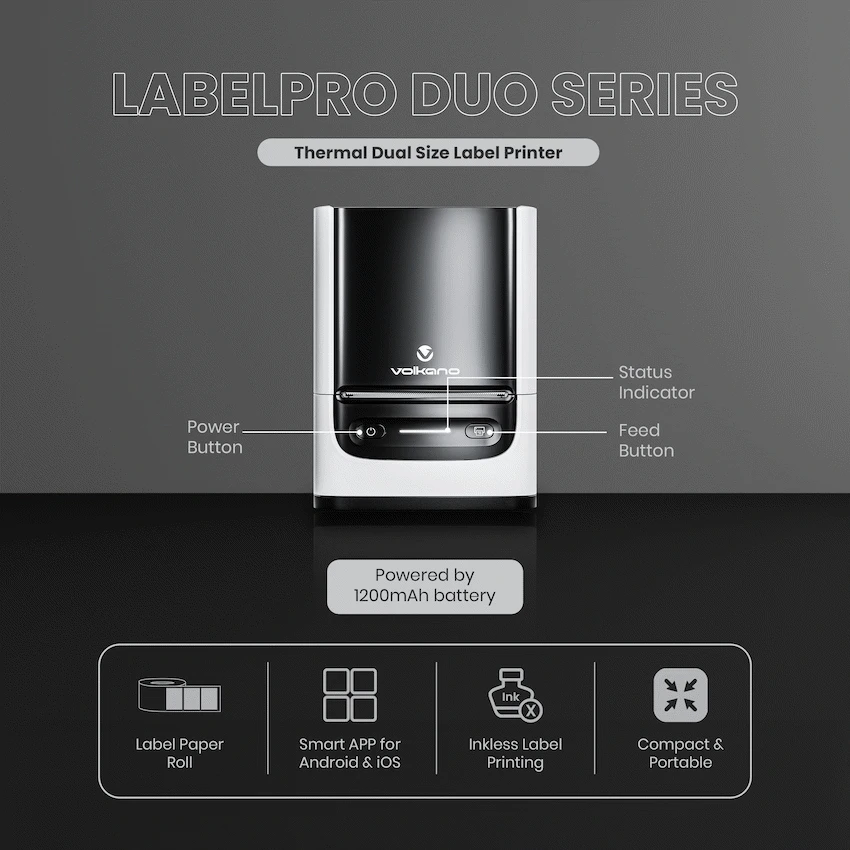 Streamline your labelling tasks with the Volkano LabelPro Duo Series Thermal Label Printer. Compact, lightweight, and built for versatility, this dual-size printer supports both Bluetooth and USB connectivity and prints at speeds of up to 60mm/s. With intelligent label recognition, adjustable print speed, and compatibility with gap and continuous paper, it’s perfect for mobile use, office organization, retail, or logistics. Customize labels easily via the companion app and enjoy the freedom of wireless use thanks to its 1200mAh rechargeable battery.